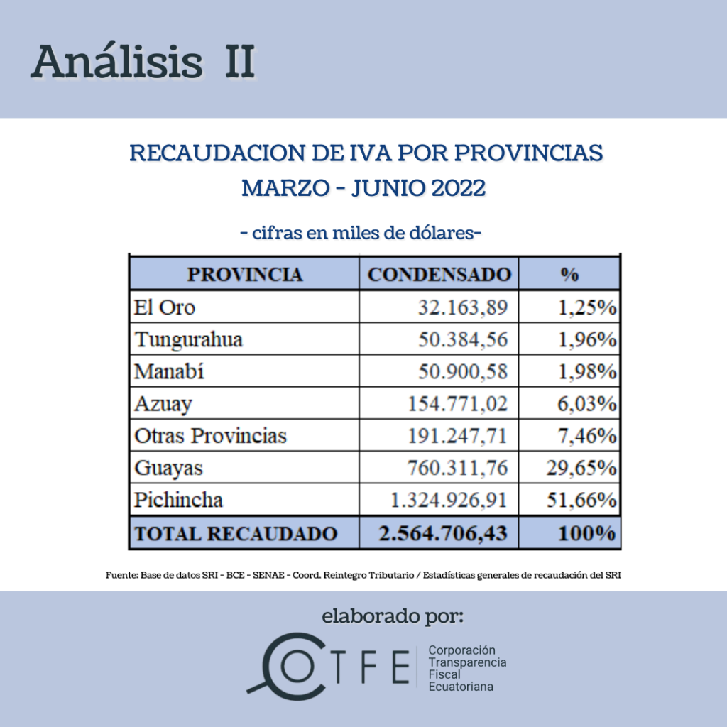 - Para finalizar, este estudio revela una vez más que, existe una desigual contribución fiscal realizada por cada provincia; nuevamente Pichicha va a la vanguardia con el 51,66%; en segundo lugar, Guayas con el 29,65%; y, en tercero Azuay con el 6,03%; les siguen Manabí con el 1,98%, Tungurahua con el 1,96%, El Oro con el 1,25% y el resto del país suman el 7,46%.